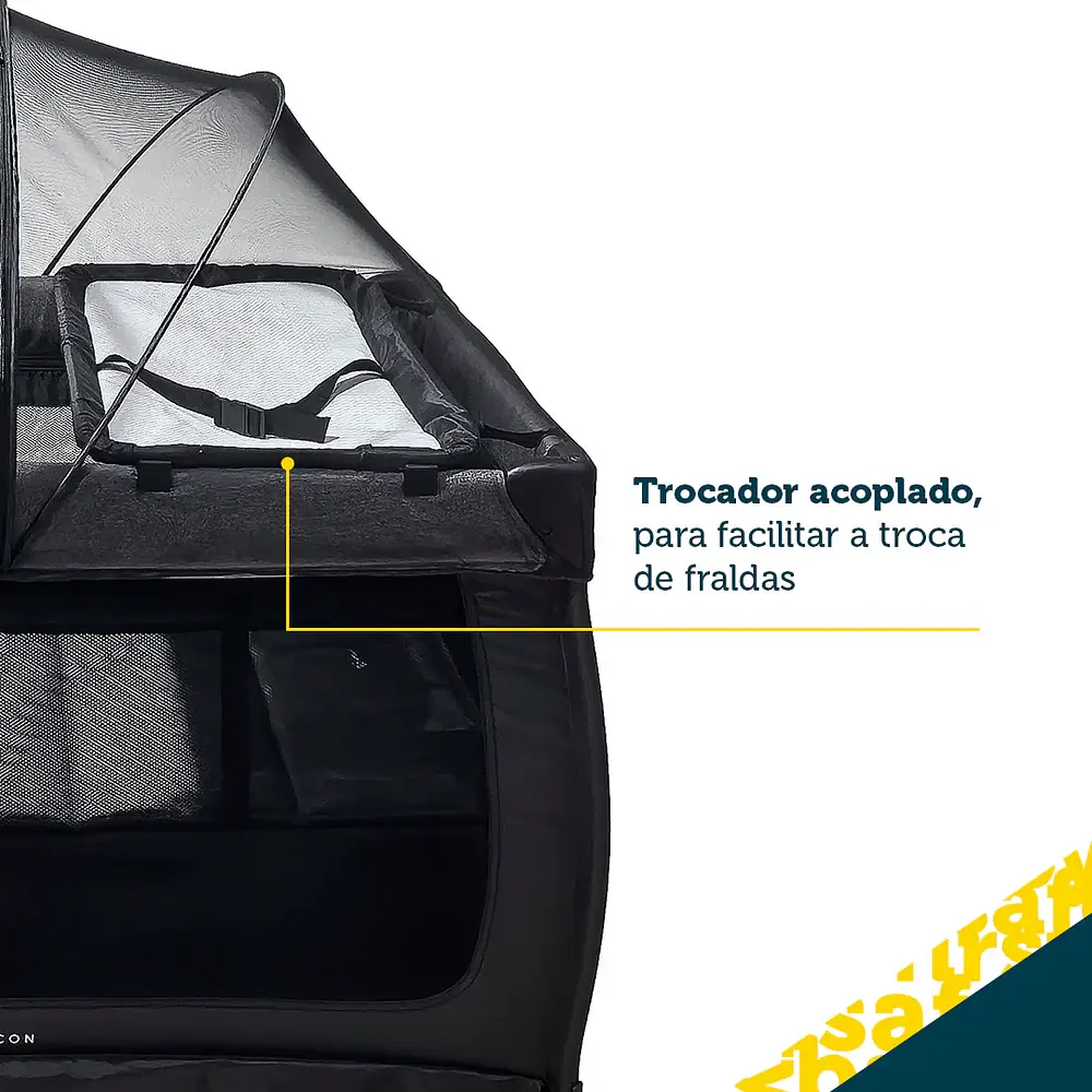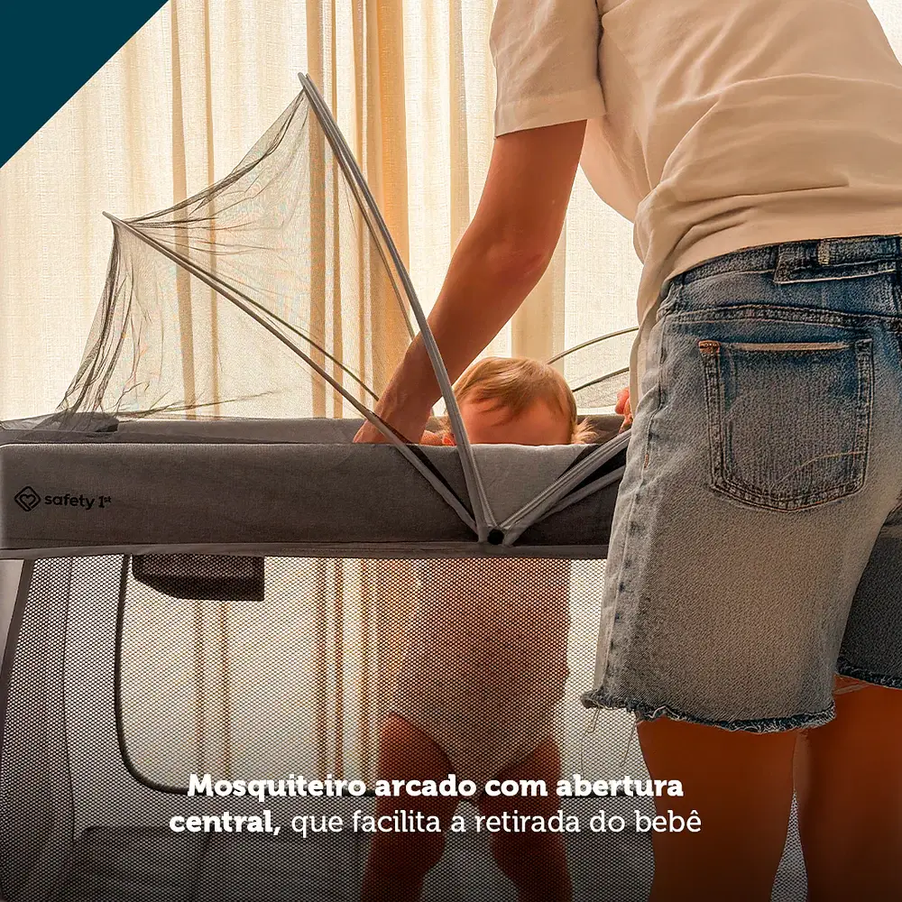 - Mosquiteiro arqueado com abertura central, que protege contra insetos e facilita a retirada do bebê.